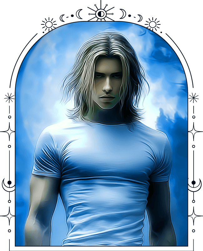 Tall and lean, with an angular jaw and pale skin, he moves with quiet confidence. He dresses simply—black jeans, a white T-shirt, and black combat boots—but on him, simplicity becomes something striking, almost regal. There’s a calm in his presence, but also mystery, as if he’s seen too much of both heaven and earth to belong fully to either.