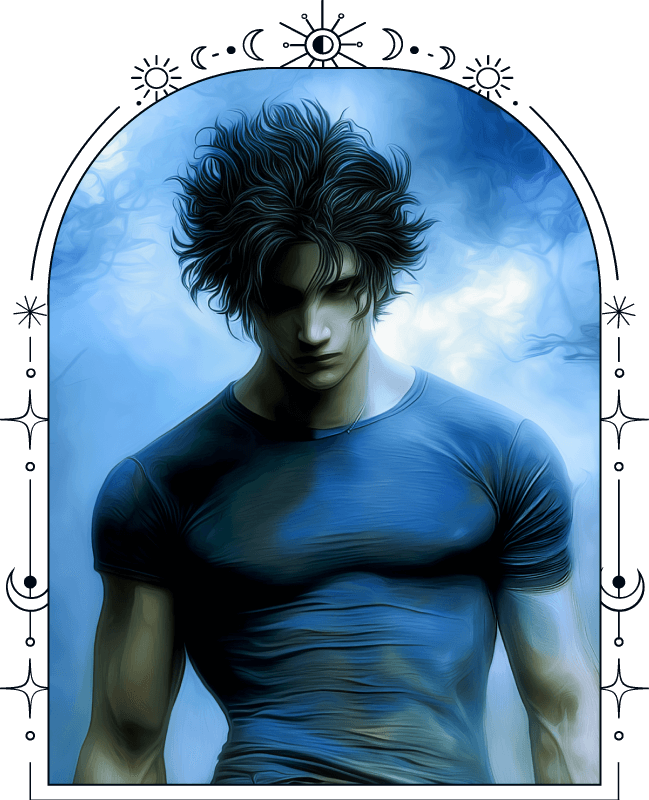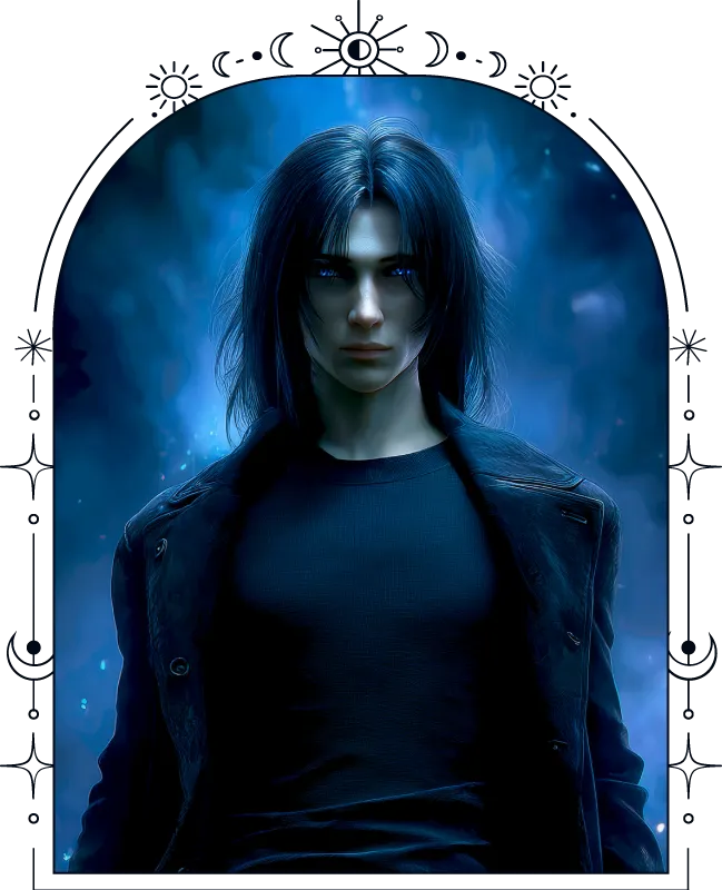 Zale has straight black hair that brushes his shoulders, framing a face almost too perfect to be human. His skin is flawless, sharp cheekbones and full lips lend him an ethereal, dangerous beauty. His eyes, piercing blue. They hold a weight that doesn’t belong to someone his age.