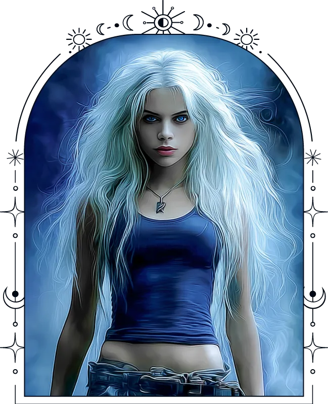 Slender and striking, with long white hair that shimmers like starlight and skin pale as moonlight, Minna is the kind of beautiful that can unsettle a room. Her sharp eyes miss nothing, and her smile rarely reaches them. Dressed in a tank top, shorts, and scuffed combat boots, she moves with the effortless confidence of someone who has lived far longer than she appears.