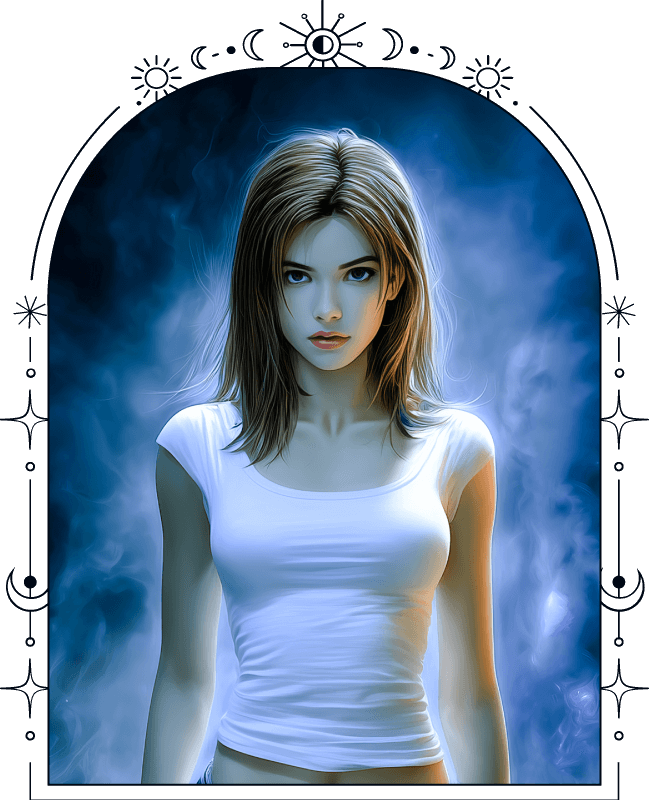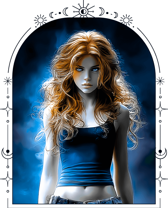 Long auburn hair frames a face as pale and flawless as porcelain, her sharp blue eyes glinting with secrets she has no intention of sharing. There’s a cool confidence in the way she moves—measured, deliberate, and always in control. She can charm with a smile, disarm with a word, and destroy without ever raising her voice.
